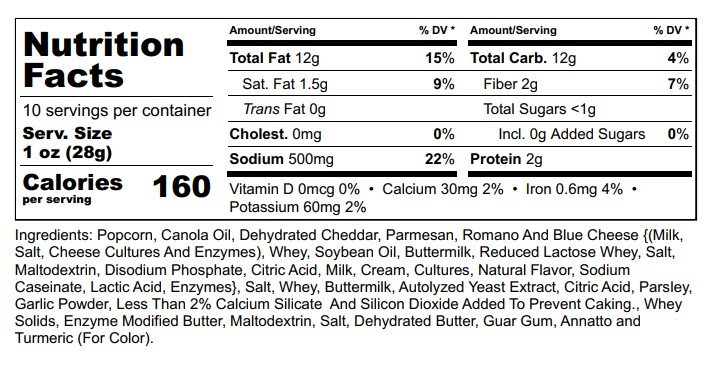 A delicious blend of creamy white cheddar cheese, coating our gourmet popcorn. For cheese lovers EVERYWHERE! 1 gallon. Trans fat free. 100% whole grain. GMO free corn. 100% gluten free. No high fructose corn syrup.