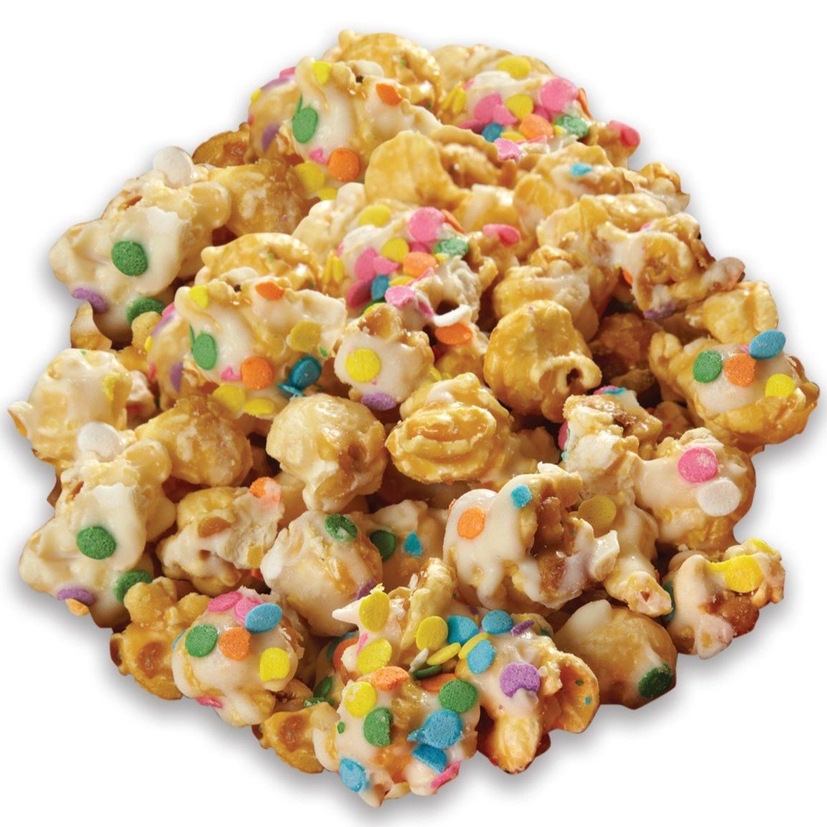 Birthday cake popcorn is a party in a bag! We take our freshly popped corn and cover it in a sweet vanilla glaze, then finish it off with confetti sprinkles.