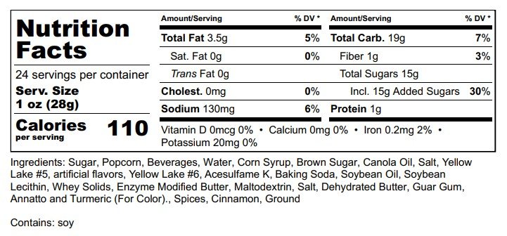 Full of fresh butter, sugar and real cinnamon. It will bring back memories of your favorite cinnamon toast cereal. 1 gallon. Trans fat free. 100% whole grain. GMO free corn. 100% gluten free. No high fructose corn syrup.
