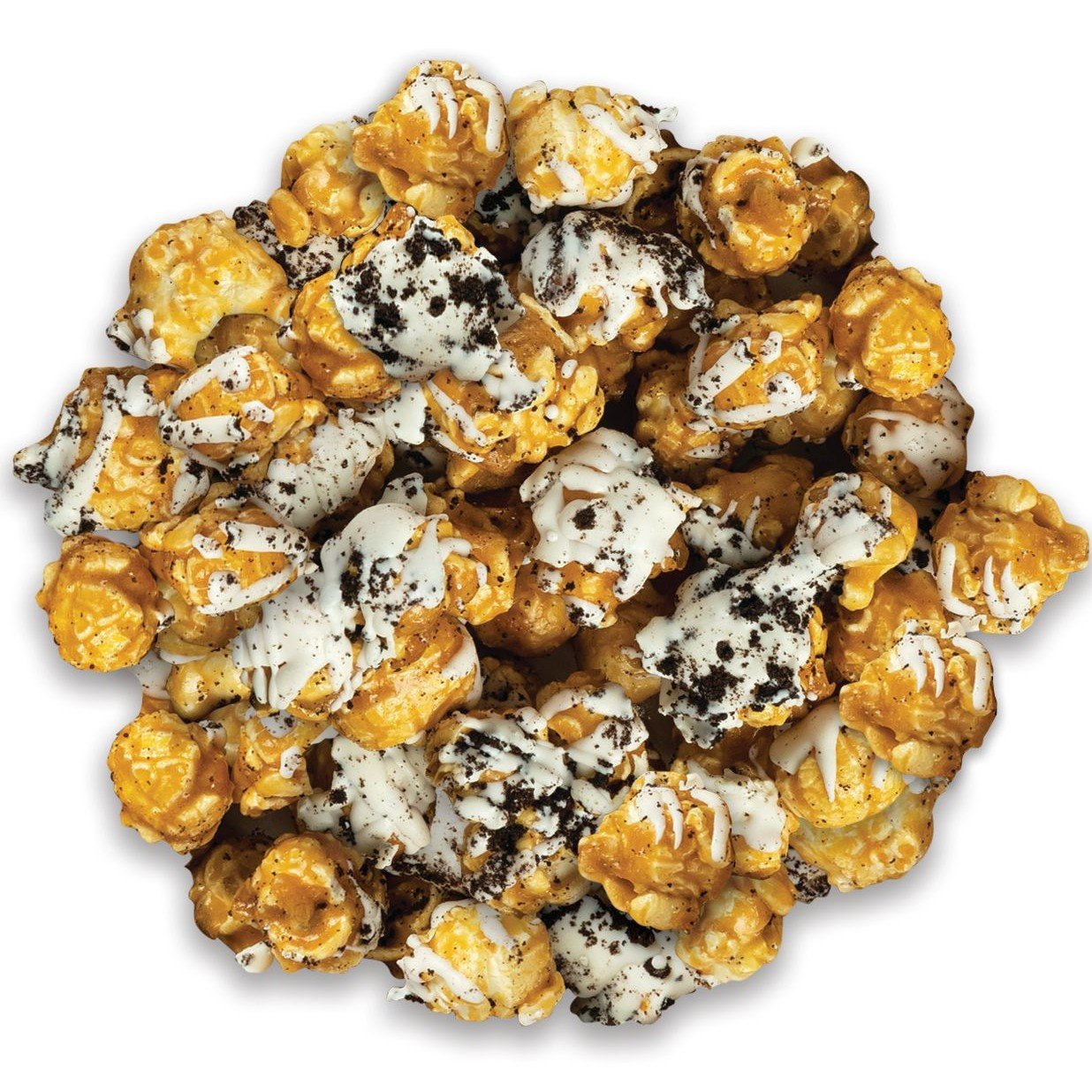 Chocolate sandwich cookie crumbles mixed with a rich white vanilla cream frosting, drizzled over fresh popcorn to make a decadent treat!